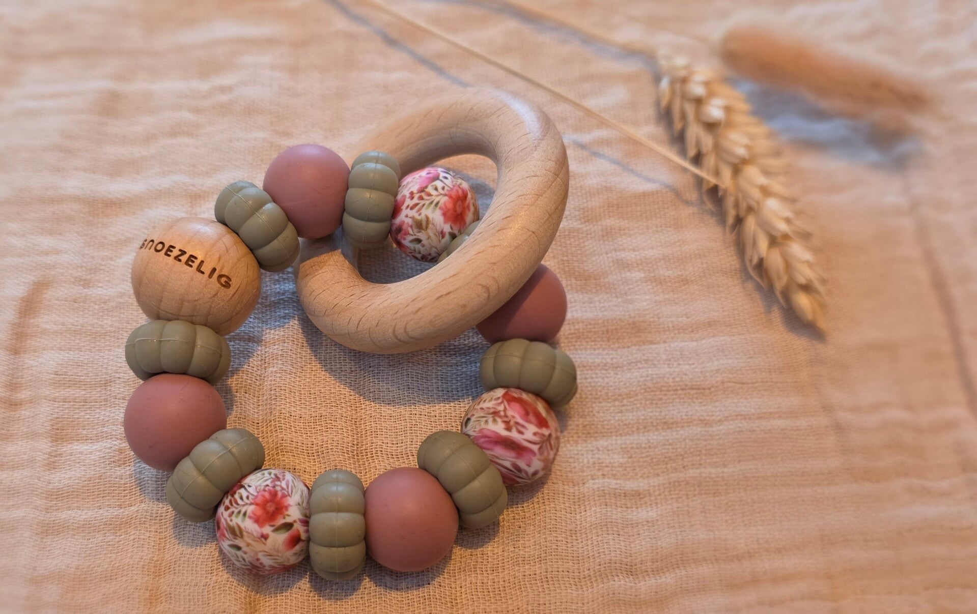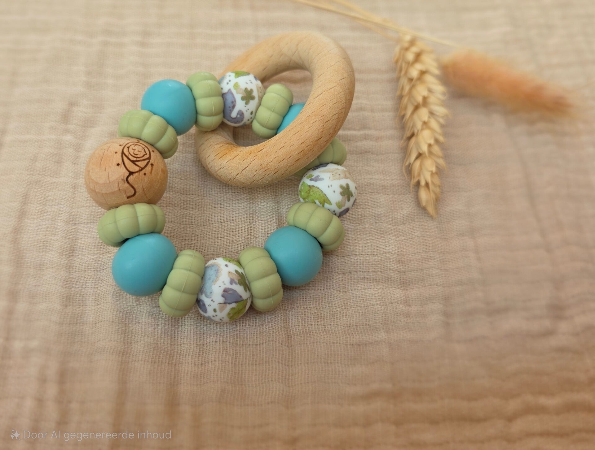- Variatie: voeg een houten figuurtje toe voor een nog leukere bijtring