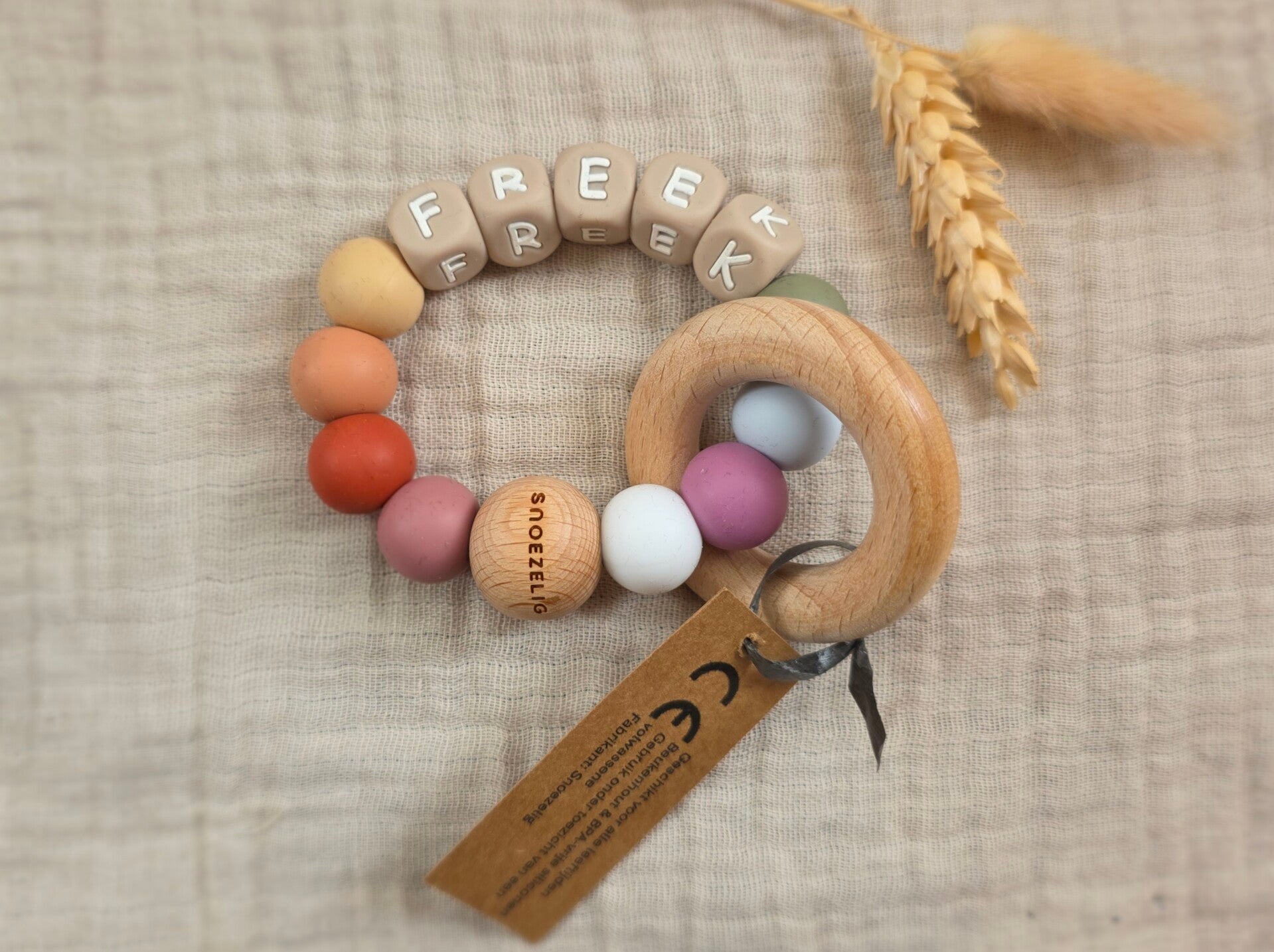 Maak deze bijtring met naam helemaal persoonlijk en verras kersverse ouders met een origineel kraamcadeau. Bestel eenvoudig online bij Snoezelig.nl