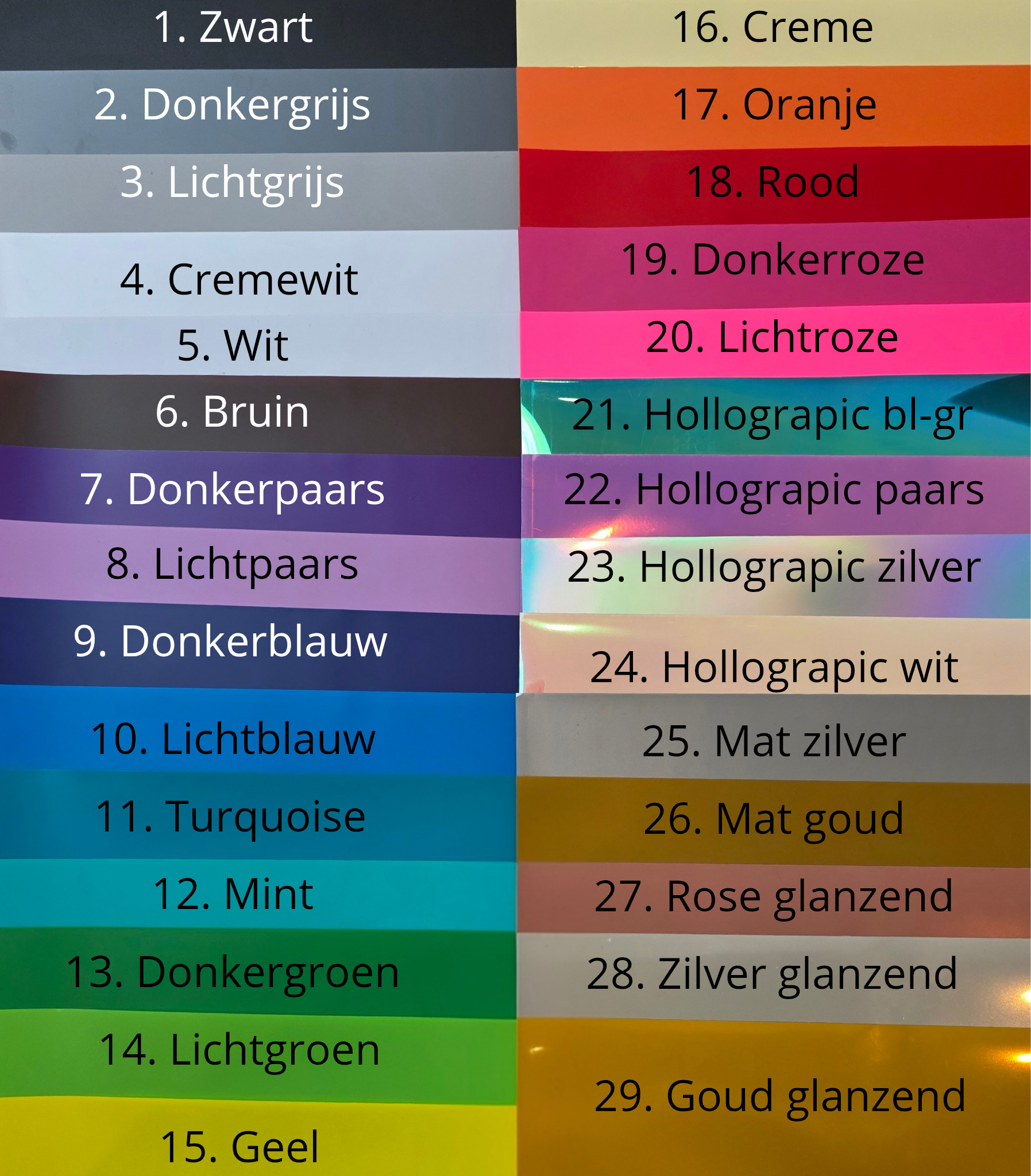 3. Kies je kleur bedrukking en gef door bij het bestellen (zie afbeelding beschikbare kleuren)