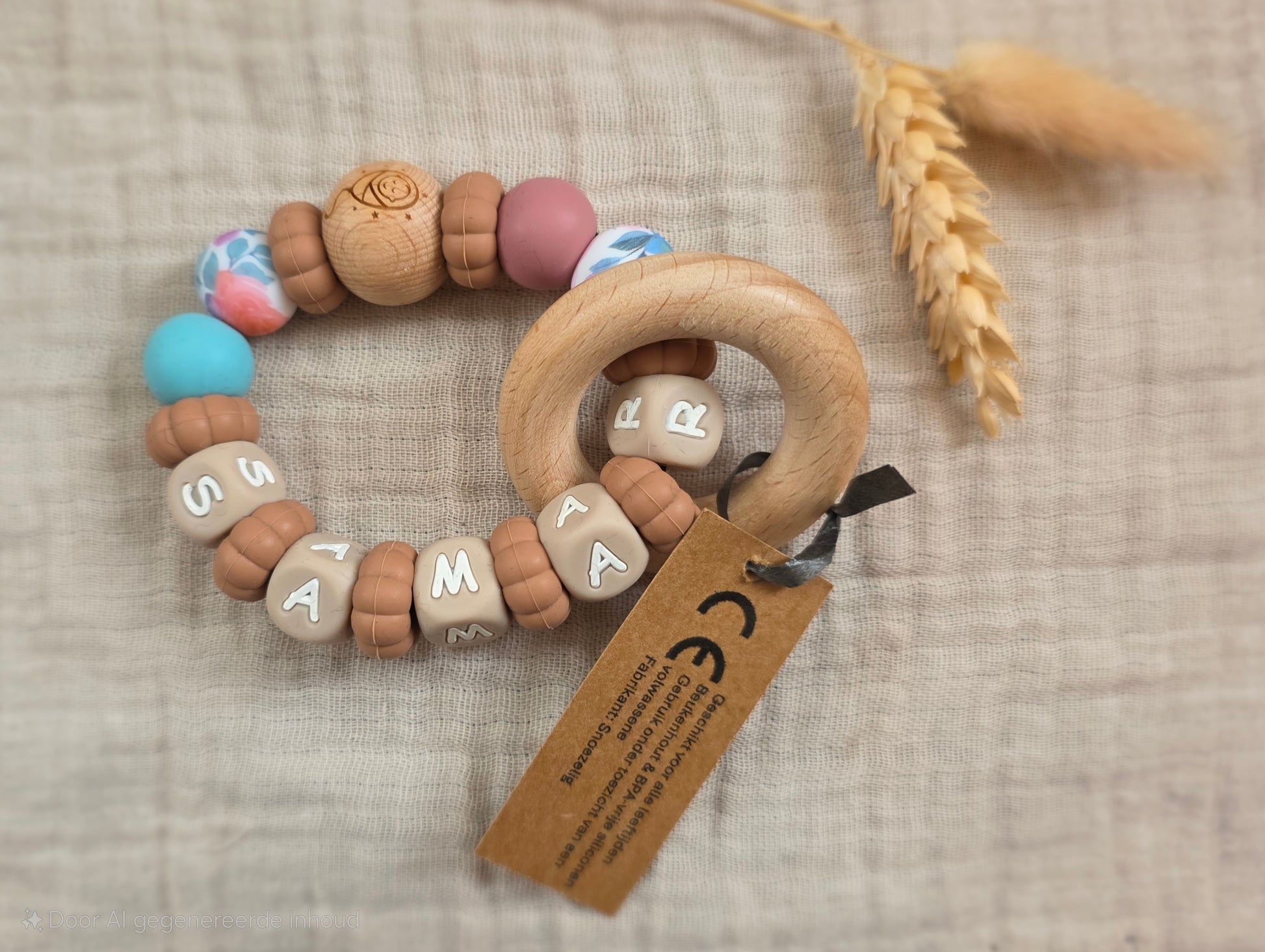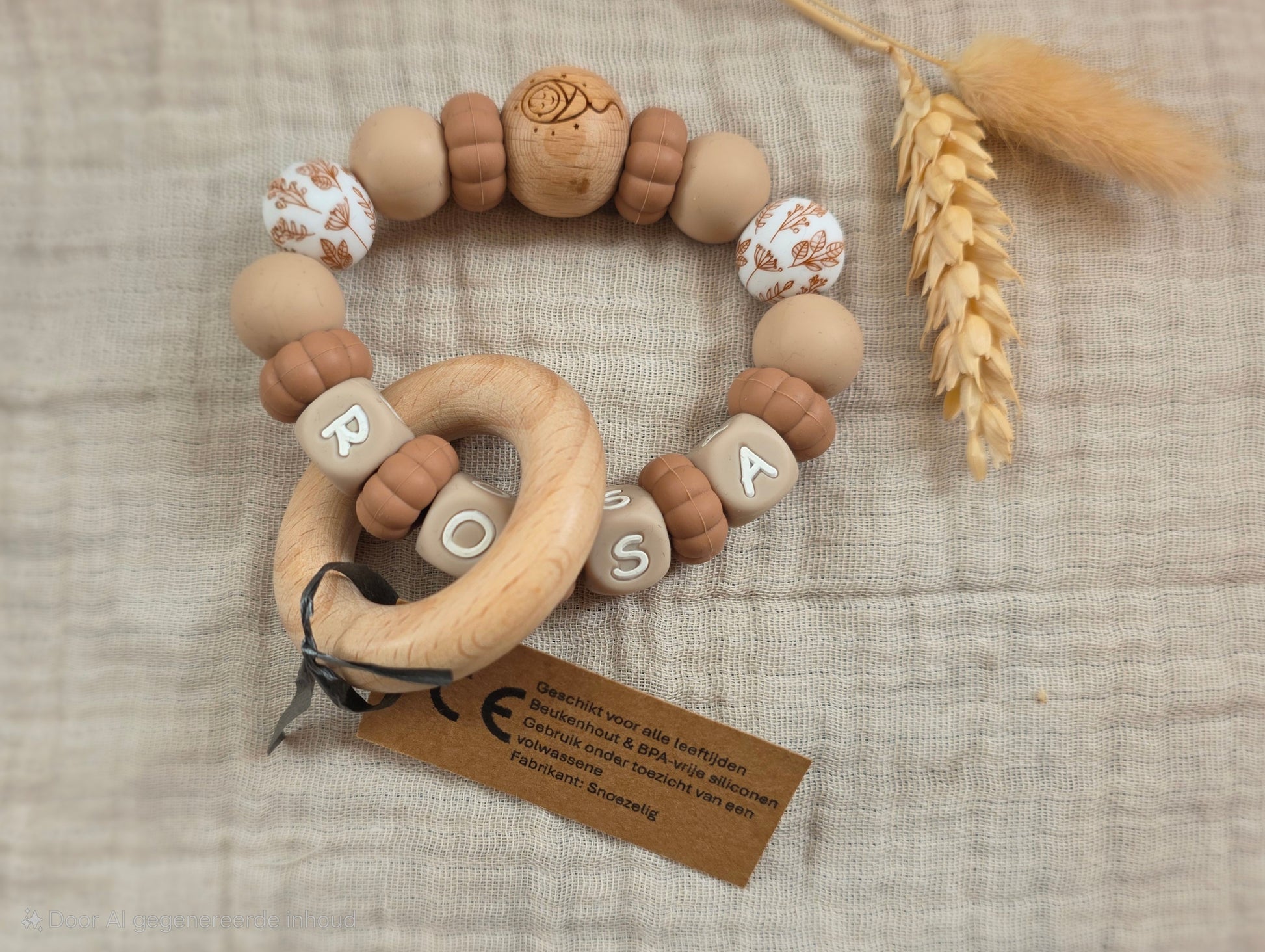 - Variatie: voeg een houten figuurtje toe voor een nog leukere bijtring