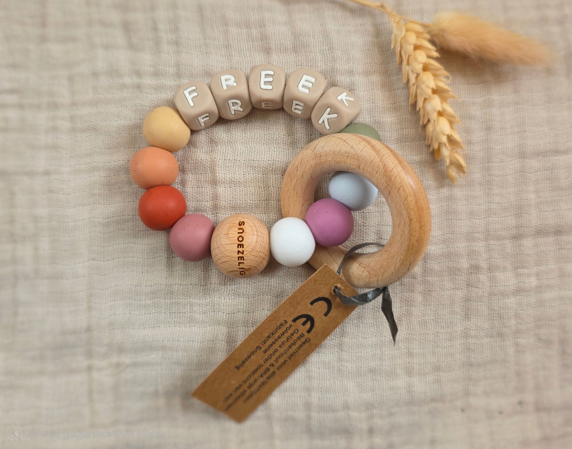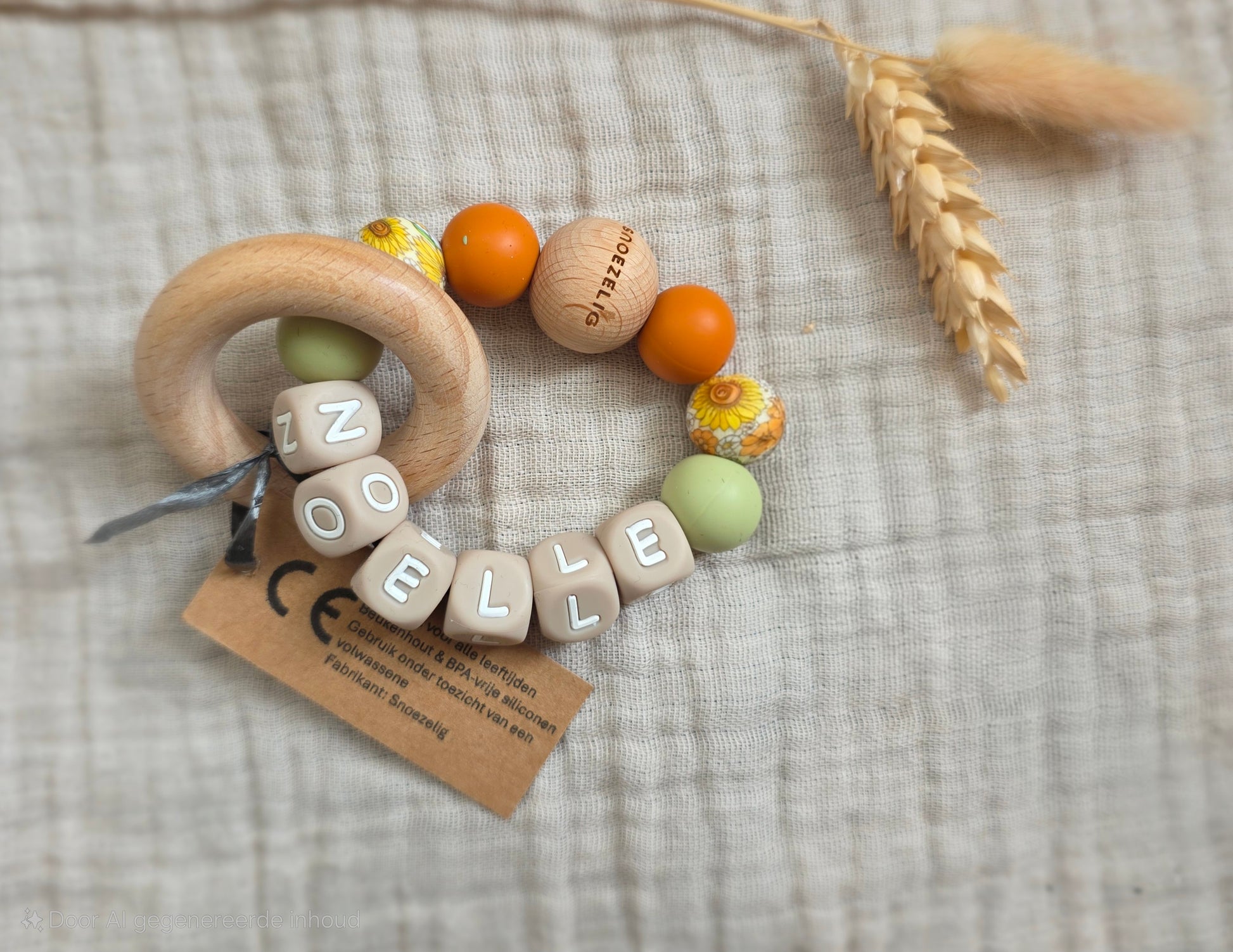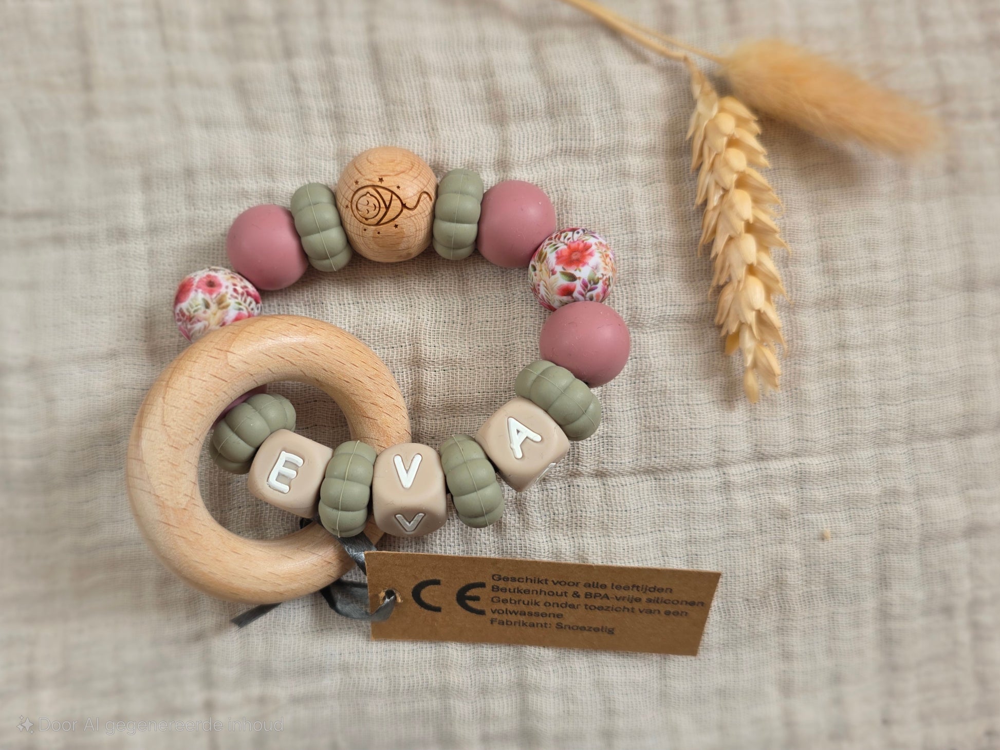 Een bijtring met naam is een fijn item voor iedere baby, want de bijtring helpt bij het masseren van het tandvlees wanneer die vervelende tandjes doorkomen. Naar wens is er een figuurtje toe te voegen, om de bijtring nóg leuker te maken!
