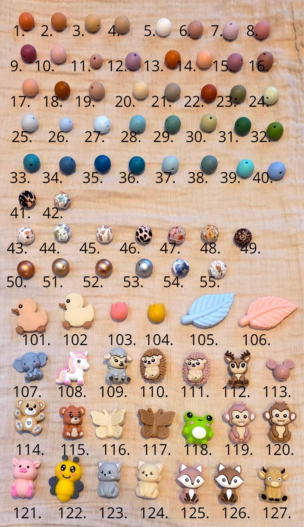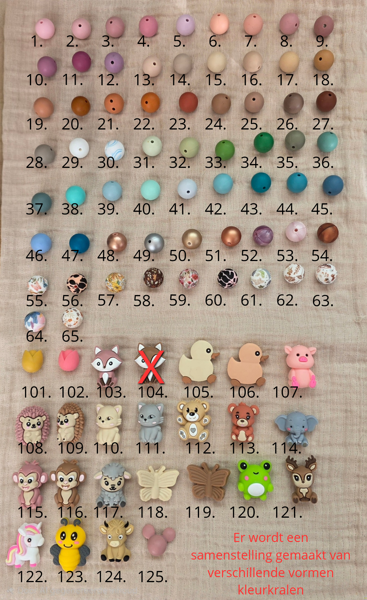 - Keuze uit siliconen (taupe) of houten letterkralen